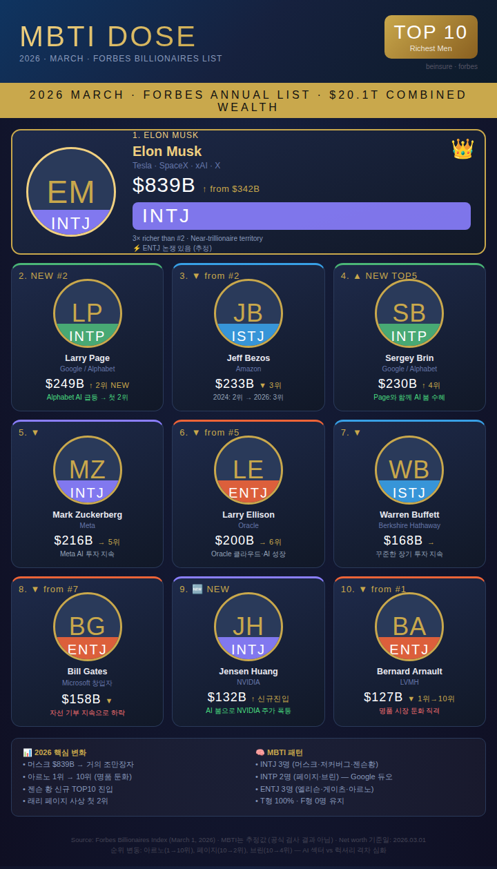 - INTJ·INTP 셀 압도적 밀집 — 억만장자+AI리더 집중