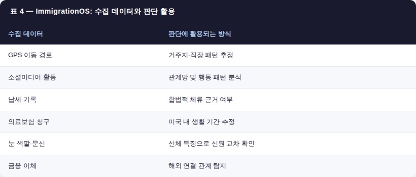 ImmigrationOS는 2025년 ICE와의 계약으로 새롭게 개발된 플랫폼이다. 정부 공식 문서는 팔란티어를 “유일한 공급자”로 명시했다. 소셜미디어 활동, GPS 이동 경로, 납세 정보, 의료 데이터, 생체 특징까지 융합해 불법 체류자를 특정하는 데 사용된다.